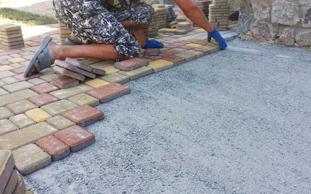 Чтобы не топтаться по утрамбованному песку, изделия укладывают в направлении от себя. Мастер, находясь на уже выложенной поверхности, укладывает брусчатку перед собой, немного вдавливая в песчаное основание, и по ней же продвигается вперед.