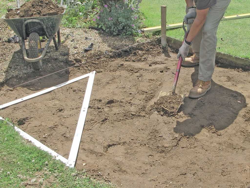 Снятую плодородную почву рекомендуется переместить на клумбы или газоны. В том случае, если верхний слой не плодородный и планируется завоз чернозема, то копать не нужно, а просто выполнить подсыпку тонкого слоя щебня. Если верхний слой глиняный, то и подсыпать не нужно — просто немного подравняйте поверхность и все.