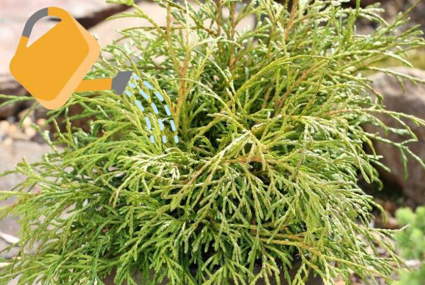 Хотя с возрастом Нитевидная туя становится засухоустойчивой, недавно посаженный саженец нуждается в постоянном увлажнении. В течение первых 1–2 месяцев после посадки в грунт поливы должны быть еженедельными. В жаркую погоду частоту поливов следует увеличить до 2 раз в неделю.