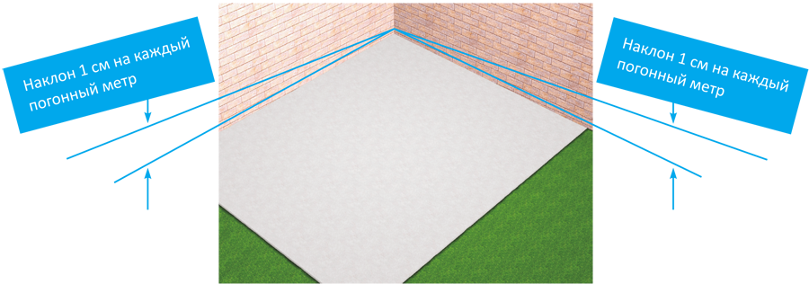 Уклон нужен для обеспечения свободного стока дождевой воды в желоба-канавки дренажного типа. Для нормальных условий этот показатель выбирается в пределах от 5 до 10 процентов уклона или 0,5-1,0 см на погонный метр Для разметки участка используются колышки и шнур-бечевка, определяющие зону укладки плитки.