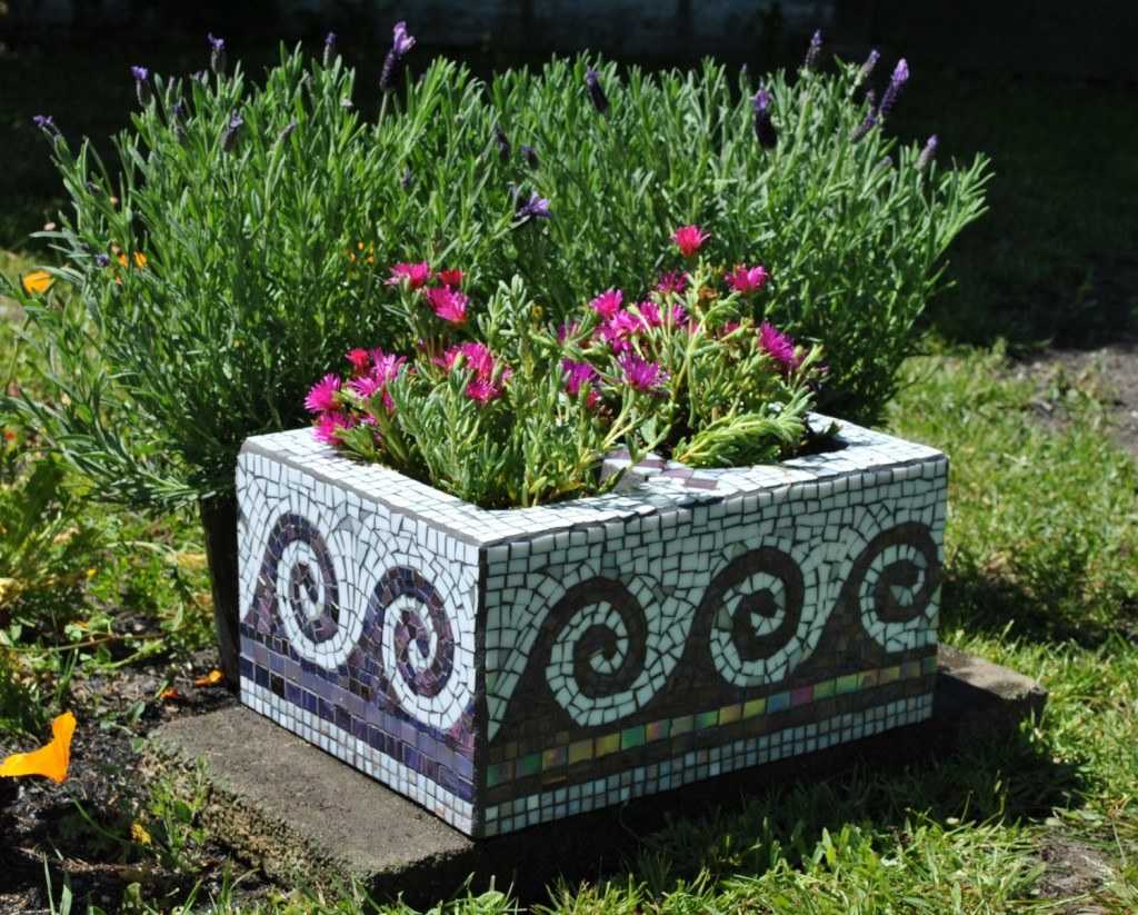 Прежде чем приступить к изготовлению уличного вазона, тщательно продумайте его оформление. Для декора можно использовать симпатичные камушки, кусочки зеркал, монетки, бусины, ракушки, фрагменты керамической плитки для мозаики и т.д. Все элементы необходимо закрепить строительным клеем или эпоксидной смолой.