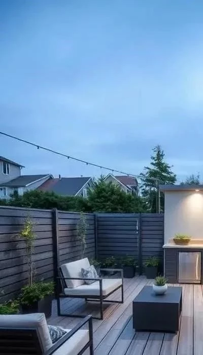 Мебель должна быть лаконичной и удобной: простые стулья и стол, диван с прямыми формами. Создание ощущения простора – ключевая задача. Добавьте встроенную солнечную подсветку, автополив для вертикального озеленения, или биокамин для создания уютной атмосферы. Шторы плиссе помогут регулировать освещение и защитить от солнца.
