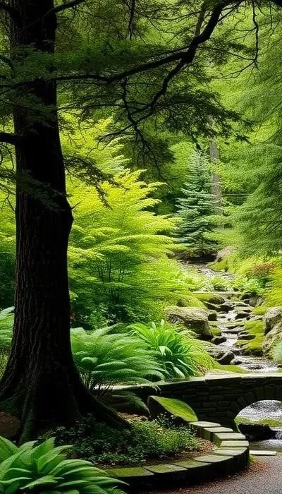 Растительность: Преобладание местных видов деревьев (дуб, береза, клен), кустарников (шиповник, калина) и многолетних трав. Создание естественных лугов и рощ. Водные элементы: Естественные пруды, ручьи, имитирующие природные водоемы. Дорожки: Извилистые тропинки, вымощенные натуральным камнем, гравием или деревянными спилами. Освещение: Мягкое, приглушенное освещение, подчеркивающее естественную красоту ландшафта.
