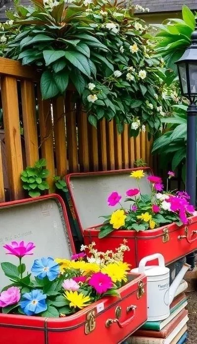 10. Декор из старых чемоданов: Старые чемоданы можно использовать как подставки для растений, или как декоративные элементы, расставив их в разных уголках сада.