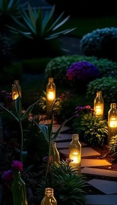 9. Ограждения для клумб из стеклянных бутылок: Вкопайте стеклянные бутылки горлышком вниз вдоль края клумбы, создавая оригинальное и декоративное ограждение.