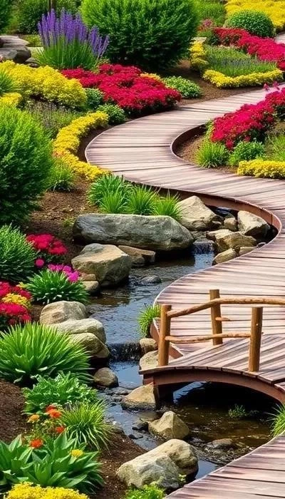 - Деревянные дорожки и мостики: придают саду естественный вид и облегчают передвижение по участку.