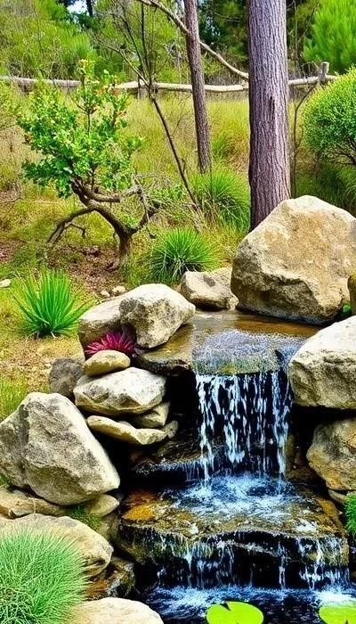 Фонтан в природном стиле – гармония с окружающей средой. Особенности: имитация ручья, водопада или пруда, использование натуральных камней и растений. Плюсы: создает атмосферу умиротворения, привлекает птиц и насекомых, не требует сложного ухода (от 30 000 рублей). Минусы: требует достаточно места для реализации. Подходит для участков в стиле кантри или прованс.