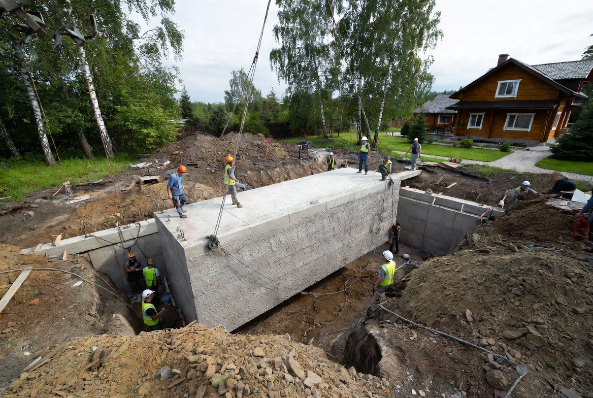 Монтаж бетонного погреба принципиально отличается от установки пластикового и требует обязательного привлечения тяжёлой техники. Основные этапы выглядят следующим образом: